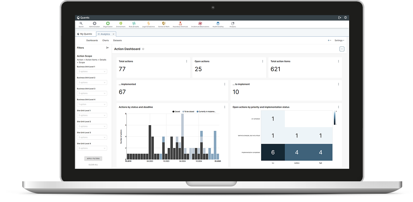 Quentic Analytics tilt uw visuele data-analyse naar een hoger niveau. U beschikt over robuuste KPI’s en diagrammen over uw HSEQ- en ESG-kengetallen, eenvoudig toegankelijk voor leidinggevenden op alle niveaus. Interactief bestuurbare dashboards bieden snel overzicht en verduidelijken actuele trends en ontwikkelingen. Maak HSEQ- en ESG-management gemakkelijker en neem duidelijke beslissingen op basis van solide gegevens.