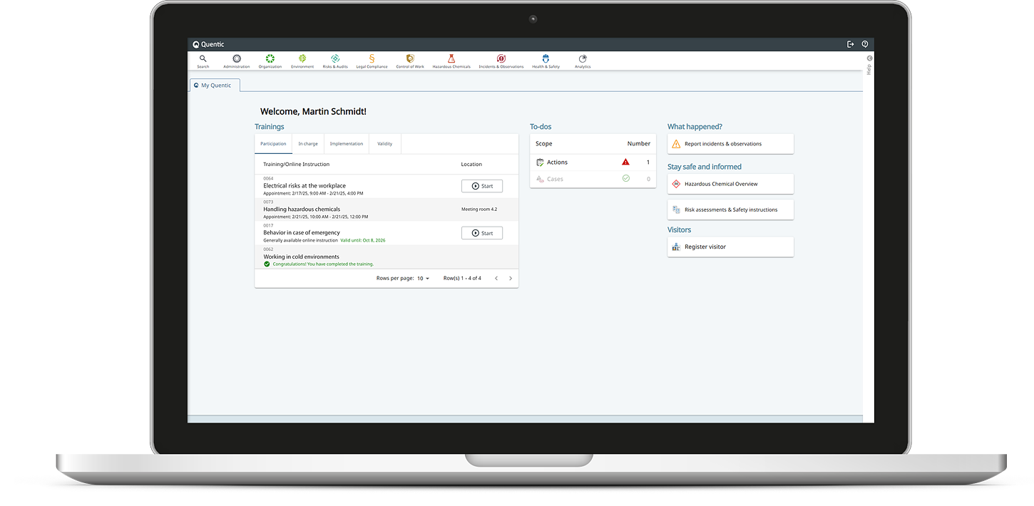 Met Quentic Core beschikt u over een basis voor arbeidsveiligheid en milieubescherming binnen uw bedrijf en alle aanvullende Quentic-modules. Met het geïntegreerde actie- en documentbeheer kunt u belangrijke informatie over de afdelingen heen combineren.